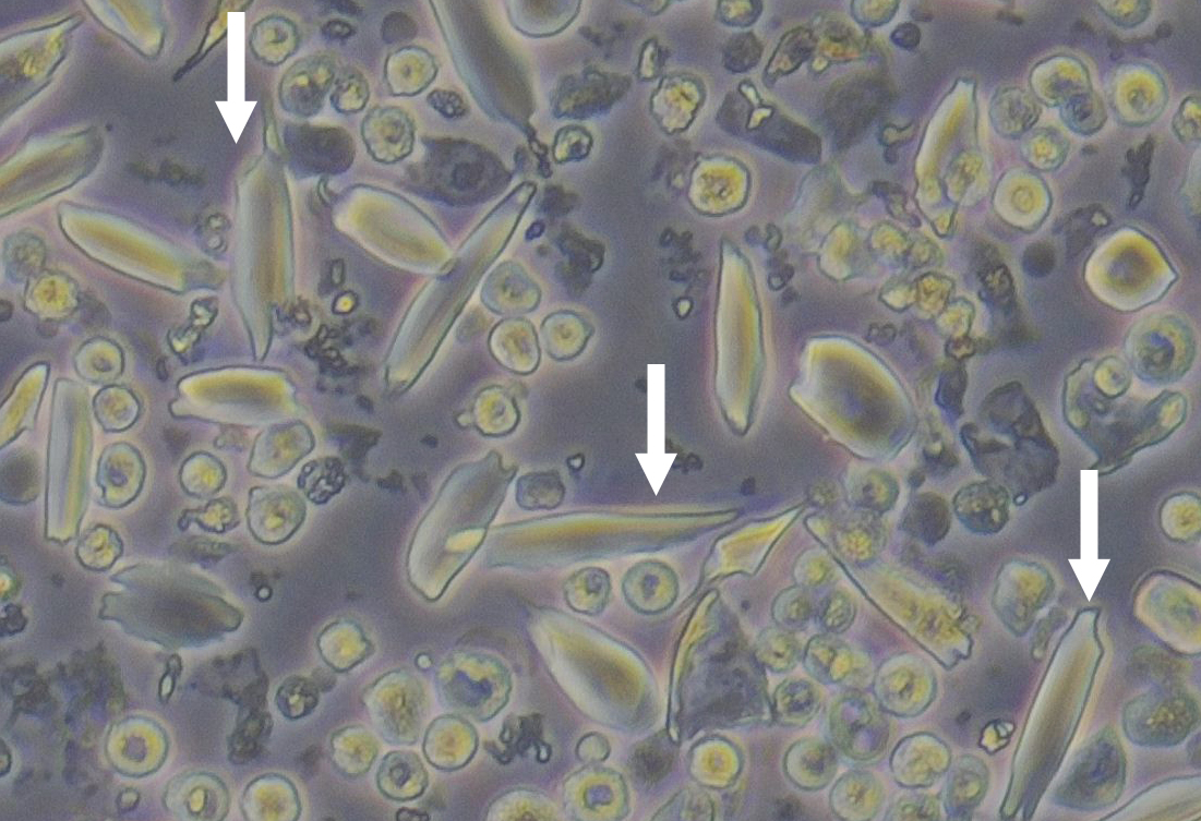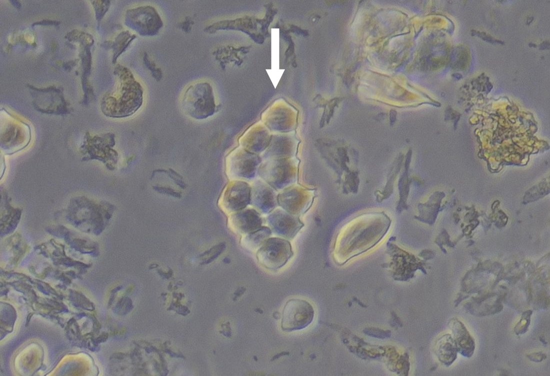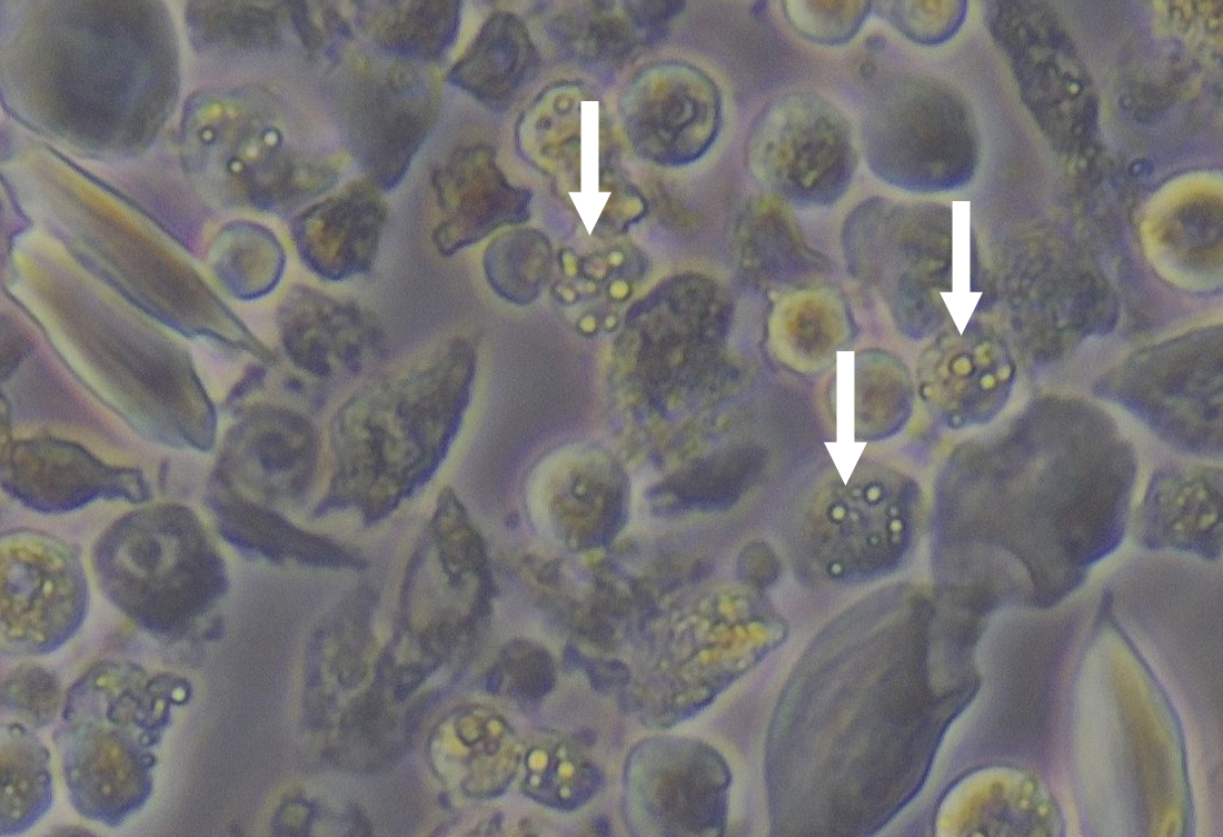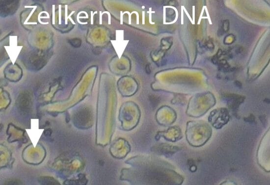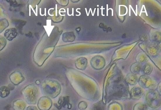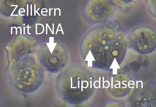 Bei den gezeigten Zellen handelt es sich um Keratinozyten-Vorläuferzellen (siehe weiße Pfeile), die ihre Stammzellfähigkeit behalten und sich daher weiter spezialisieren können. Im Labor erscheinen sie als goldene Kugeln – unser Spitzname „Kintama“ kommt vom japanischen Wort für „goldene Kugel“. Diese Kugeln schwimmen in Flüssigkeit und übernehmen vermutlich eine unterstützende Rolle, um Haare gesund und kräftig zu halten. In hoher Dichte können sie pentagonale Keratinozyten-Blätter bilden. Außerdem tragen sie zur Bildung der Haut bei.