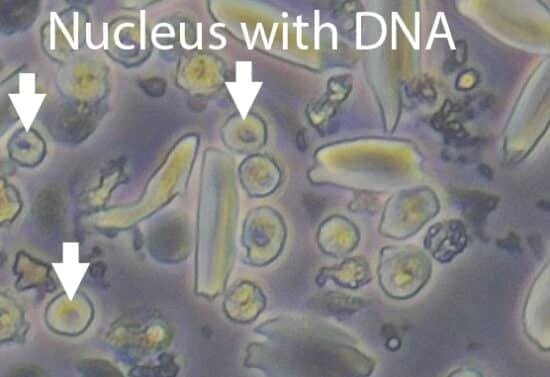 Honeycomb cells are another type of keratinocyte. Not much is known about them, but in the lab, they are observed floating in liquid and always appear in groups or sheets. It is speculated they might be Kintama cells that are still joined together. In this configuration, they don’t have a golden shine compared to when they are alone. Furthermore, the nucleus of each cell can be clearly seen, with each containing a complete set of your DNA. However, whether they are really Kintama cells remains to be determined.