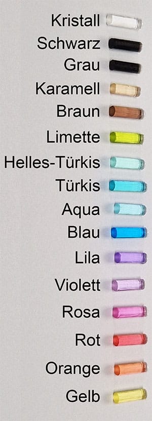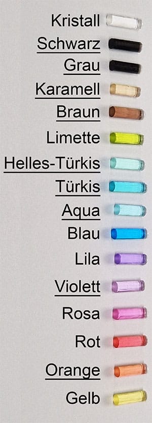 16 Farben Kristall Gelb Orange Rosa Rot Blau Aqua Türkis Helles-Türkis Limette Violett Lila Karamell Braun Grau Schwarz |